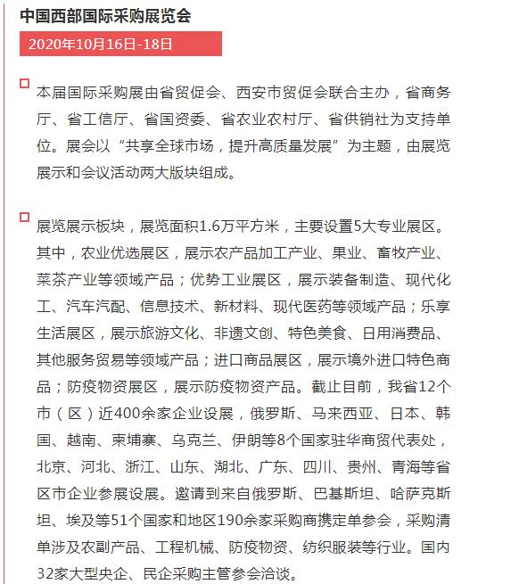 中國西部國際采購展覽會(huì)(以下簡稱“國際采購展”),于2020年10月16日-18日在西安國際會(huì)展中心展覽館1號(hào)展廳舉行。本屆國際采購展以“共享全球市場,提升高質(zhì)量發(fā)展”為主題,深度融入共建“一帶一路”,助力陜西打造內(nèi)陸改革開放高地,落實(shí)好穩(wěn)外資、穩(wěn)外貿(mào)的要求,更好服務(wù)疫情常態(tài)化形勢下企業(yè)開拓國際市場。我公司受西安貿(mào)促會(huì)邀請參加本次展覽會(huì)。